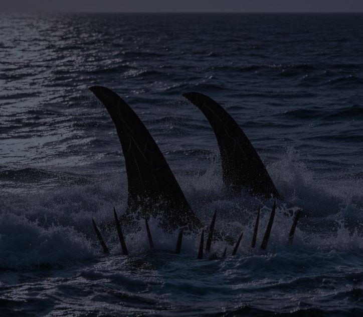 “…but one dorsal fin is immediately followed by another, and another, and another, and then two more, and then two more after that, in two separate rows, and they’re taller, by a LOT, and jagged, like some have whole chunks torn out of them, and they’re all 8-10 feet high. And they’re all attached to ONE creature, and we can just barely see its back slicing through the water, covered in these rows of spikes, and it just. Keeps. Coming. This thing is like 20 or 30 feet from the ferry, running parallel to it, and we are all transfixed. There’s like 9 or 10 of us and no one is saying a word because we’ve all turned to look at a whale and we are all now watching something that is like, horrifically, terrifyingly obviously NOT a whale.“